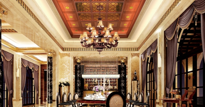 古典韻味十足的中式吊頂,為餐廳空間增添一份素雅與愜意。棕色線條在頂部來去自如,打造出一個(gè)顏值爆表的餐廳空間。