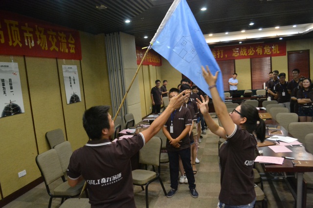 在奇力營銷部張經理一個簡單的情景案例后,導購培訓的課程正式開啟。在培訓會上,學員們們邊聽邊做著筆記。在歡樂的討論氣氛下,各個小隊的代表按照各自的營銷經驗,從材質、價格、環保等方面介紹產品,以求第一時間吸取知識和找準進步和跨越的方向。